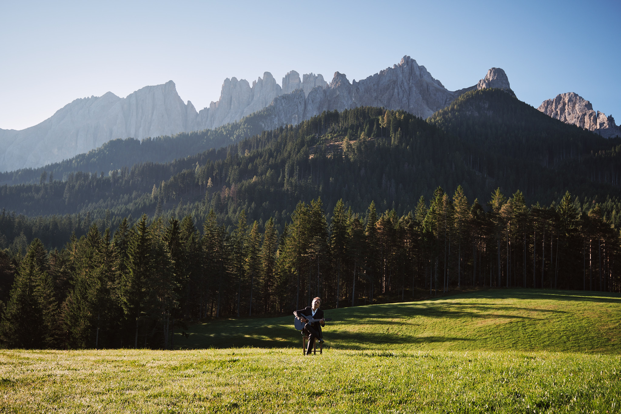 This composition, created by the exceptional guitarist and composer Manuel Randi, found its perfect home in this world full of legends and history. Manuel’s extraordinary musicianship and deep connection to the instrument brought every phrase to life, shaping a piece that resonates perfectly with the spirit of the Latemar guitar. For the creation of the song, the landscape became a constant source of inspiration – the mountains’ serene beauty, the delicate frost, and the gentle morning glow guided each musical phrase, allowing the melody to fully capture the essence of its surroundings. Even during filming, the song was played multiple times over the scene, letting the natural environment infuse the music with its unique character.